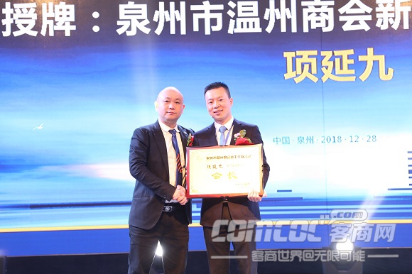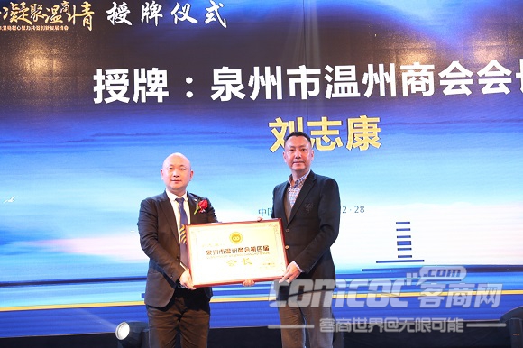 刘志康会长向泉州市温州商会新生代联合会会长项延九授牌h4i客商网-商会、协会、校友会、俱乐部资源整合社交平台