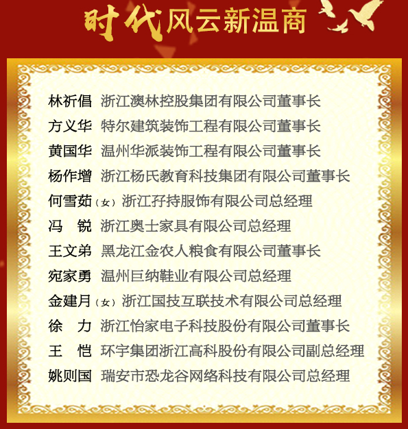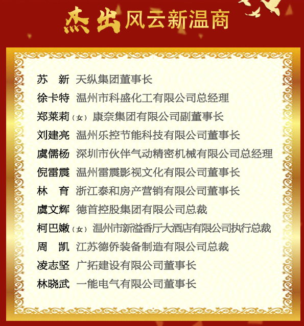 在颁奖典礼现场公布了“风云新温商”的获奖名单,共有12名新温商获评“杰出风云新温商”,12名新温商获评“时代风云新温商”,10名新温商获评“新锐风云新温商”。苏新名列其中