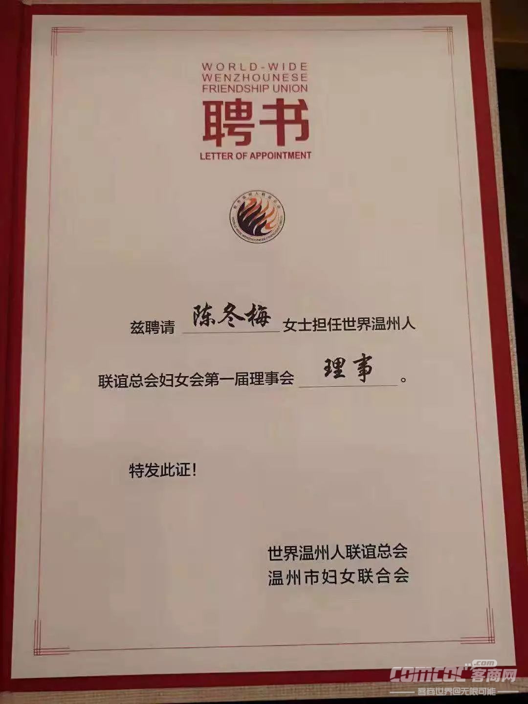 11月9日下午,世界温州人联谊总会妇女会成立!温州市委副书记陈浩在成立大会上讲话,他指出,世界温州人联谊总会妇女会的成立,是学习贯彻落实中国妇女第十二次全国代表大会精神的有力举措,是对大会提出的“加强与海外女侨胞及其组织的联络联谊”最积极地回应。世界温州人联谊总会妇女会执行主席徐小丹作表态发言。商会秘书长陈冬梅被聘为世界温州人联谊会妇女会第一届理事会理事。