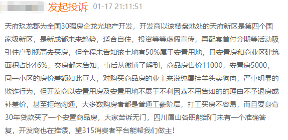 投诉内容显示,天府玖龙郡开发商为眉山龙光骏业房地产开发有限公司,为港股上市公司龙光集团关联企业。