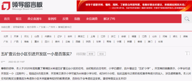 但到了2022年2月22日,有业主在广州黄埔区教育局局长接待日上得知,五矿壹云台的小学将于9月开学,但配套学校将是长岭居小学分校,一家“村小分校”。