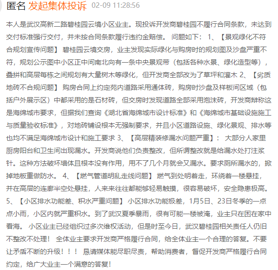 在黑猫投诉上以“购房+质量”为关键词搜索,有124条有关新房质量的投诉。其中,位于武汉市光谷的碧桂园云境,因“违反合同条款,未达到交付标准交付强行交付”被100多位业主集体投诉。