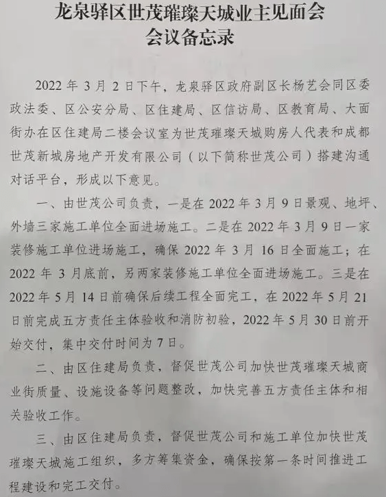 3月2日,经龙泉驿区副区长协调,各方再次进行会谈,约定3月9日为第一个复工节点等事项。