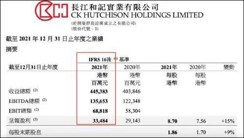 根据长和集团17日发布的2021年年度业绩,按IFRS 16后基准,该取得收益总额(营业收入)4453.83亿港元,同比增加10.29%;普通股股东应占溢利为335亿港元,同比增加15%;每股盈利8.7港元,拟派发末期股息每股1.86港元。