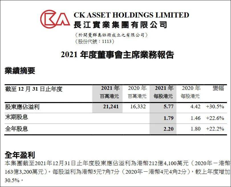 主营业务为房地产的长实集团也于同日公布2021年业绩,股东应占利润212.41亿港元,同比增长30.5%;每股溢利5.77港元,末期股息每股1.79港元。