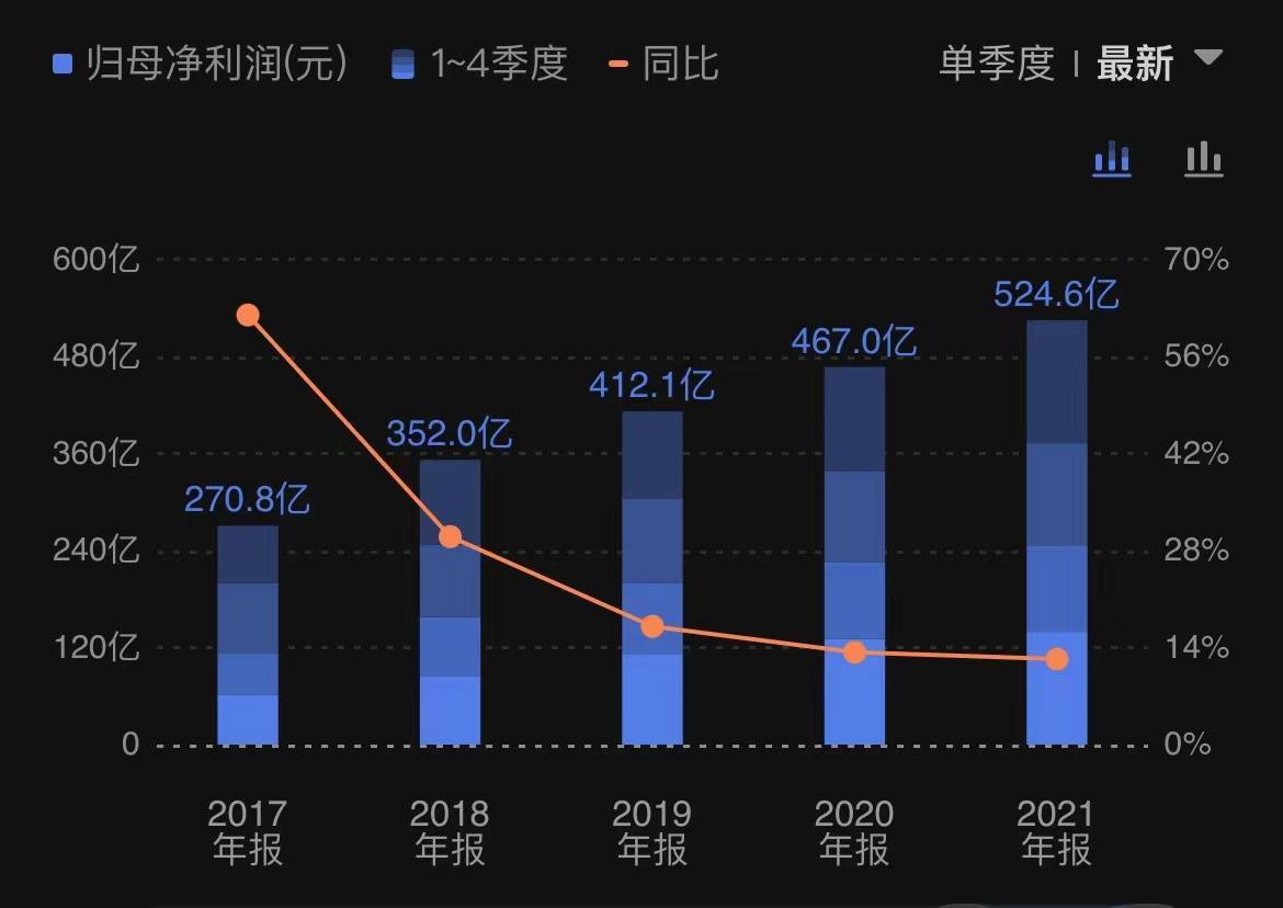虽然达成首次突破千亿元大关,但营收和净利润增速都在放缓。对比历年财报,2017-2021年,贵州茅台营收增速分别为49.81%、26.49%、16.01%、11.10%、11.88%;净利润增速分别为61.97%、30%、17.05%、13.33%、12.34%,2021年是五年内新低。