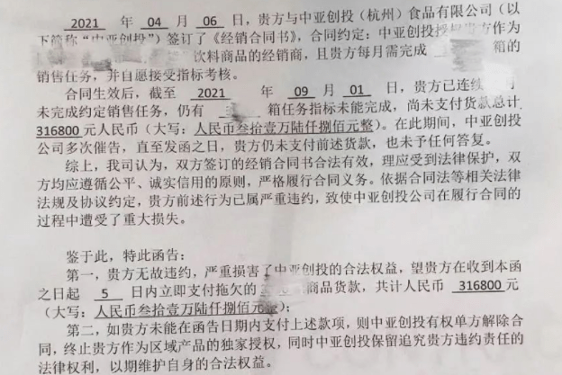 当初经销商们在糖酒会上签的只是一个简单的预付款协议,正式合同是在成都糖酒会后陆续拿到的。因为已经上交了部分定金,后期签合同时中亚创投也私下告诉他们只是走形式,具体条款可以商量,再加上娃哈哈的品牌影响力,他们并没有过多顾虑,就签了。